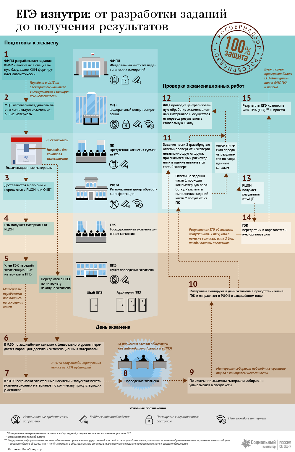 Процедура ЕГЭ ежегодно совершенствуется. Этапы подготовки и проведения экзаменов обеспечены необходимыми мерами защиты, процесс контролируется несколькими профильными организациями. Актуальные данные Рособрнадзора о ЕГЭ представлены в инфографике «Социального навигатора» МИА «Россия сегодня».