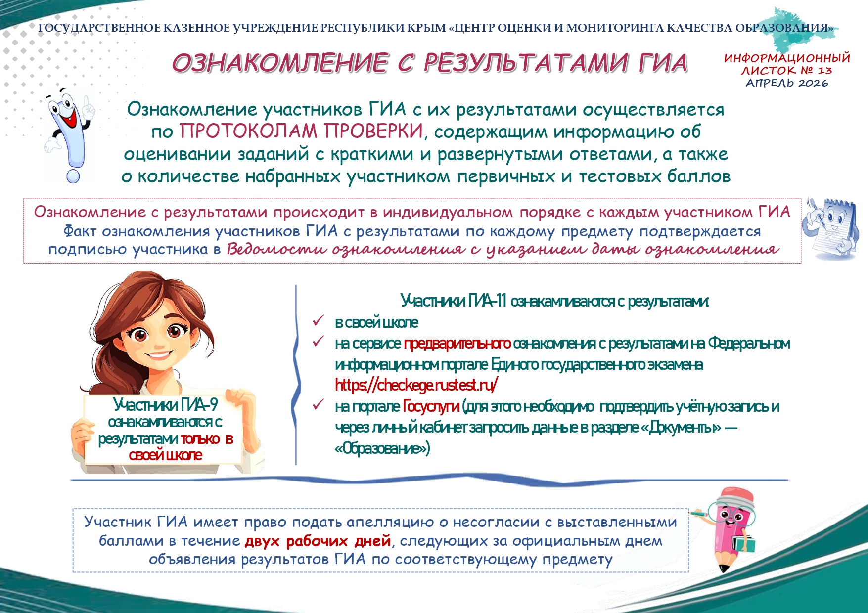 С целью оказания помощи участникам экзаменов в подготовке к государственной итоговой аттестации в 2025/2026 учебном году ГКУ РК "Центр оценки и мониторинга качества образования" направляет Информационный листок № 13 «Ознакомление с результатами ГИА».